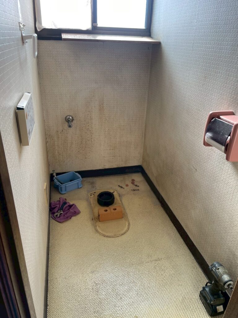 既存トイレを撤去後、床や配管の状態を確認しながら、次の工程へ進みます。